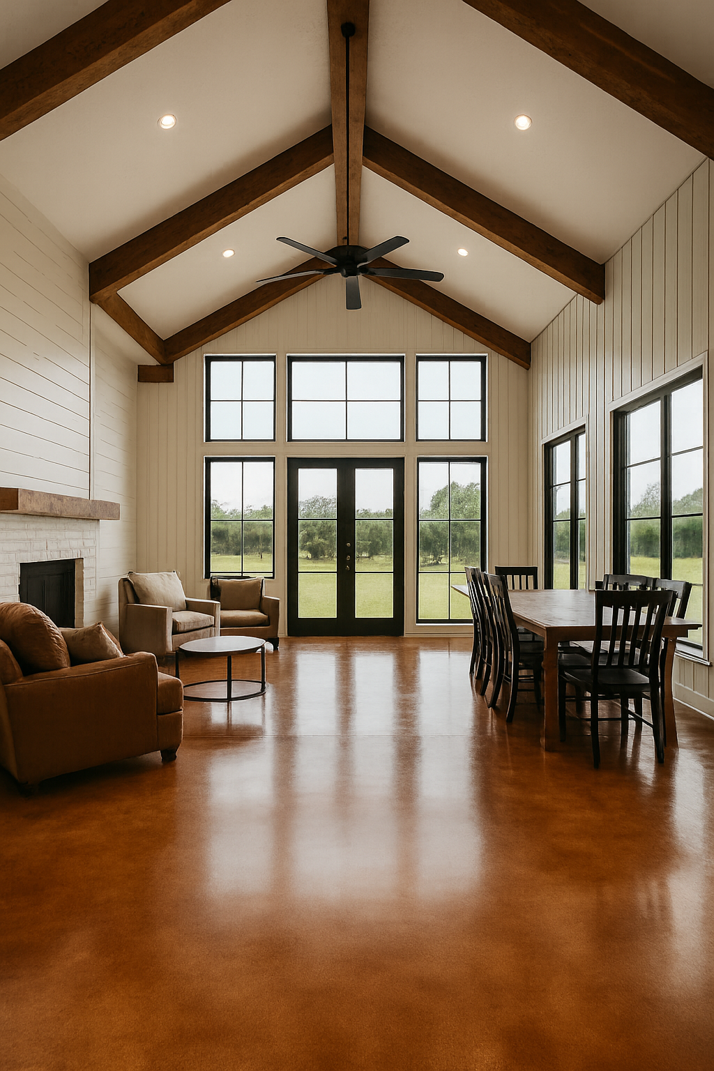 Many homeowners first consider flooring like luxury vinyl plank (LVP), tile, or hardwood. While those materials can look nice, they don’t match concrete’s ability to handle heavy traffic, pets, spills, and workshop use all while staying low-maintenance and cost-effective. Choosing to keep and finish your slab gives you a floor that is beautiful, long-lasting, and designed to complement the lifestyle of a barndominium.